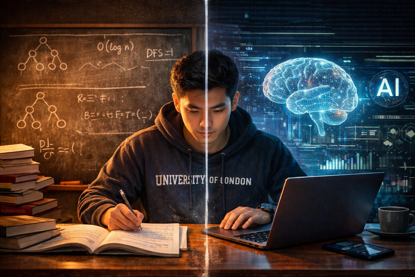 On one hand, you’re sitting through lectures on binary trees and asymptotic complexity, carefully annotating your notes like you’re preparing for an exam that, frankly, feels increasingly disconnected from the world outside the classroom window. On the other hand, you’re watching seventeen-year-olds ship full-stack applications with nothing but a Claude subscription and sheer audacity — no formal education required, no prerequisites, no gatekeeping.